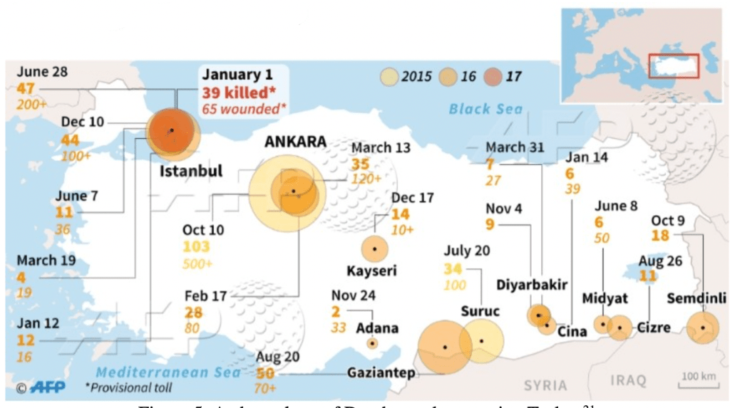 Turkey has been the target of DAESH/ISIS for years. Its location is one of the reasons as a result of high amount of FTFs using Turkey as a transit country. Moreover, they are able to organize terrorist attacks while passing from this country or when they stuck in Turkey. On the one hand, Turkey has intensified its security policies, detentions and measures. On the other hand, DAESH/ISIS has increased its attacks’ sphere of influence and amount. In this vein, the year, 2016, is categorized as a time period when DAESH/ISIS attacked Turkey the most. As it is mentioned in the previous paragraph, the attacks were taken place between 2014 and 2016 are the main indicators to argue the certain spread of the radicalization and violence caused by DAESH/ISIS through FTFs having different origins. However, Turkey successfully stopped this terrorist groups’ attacks through strong measures.